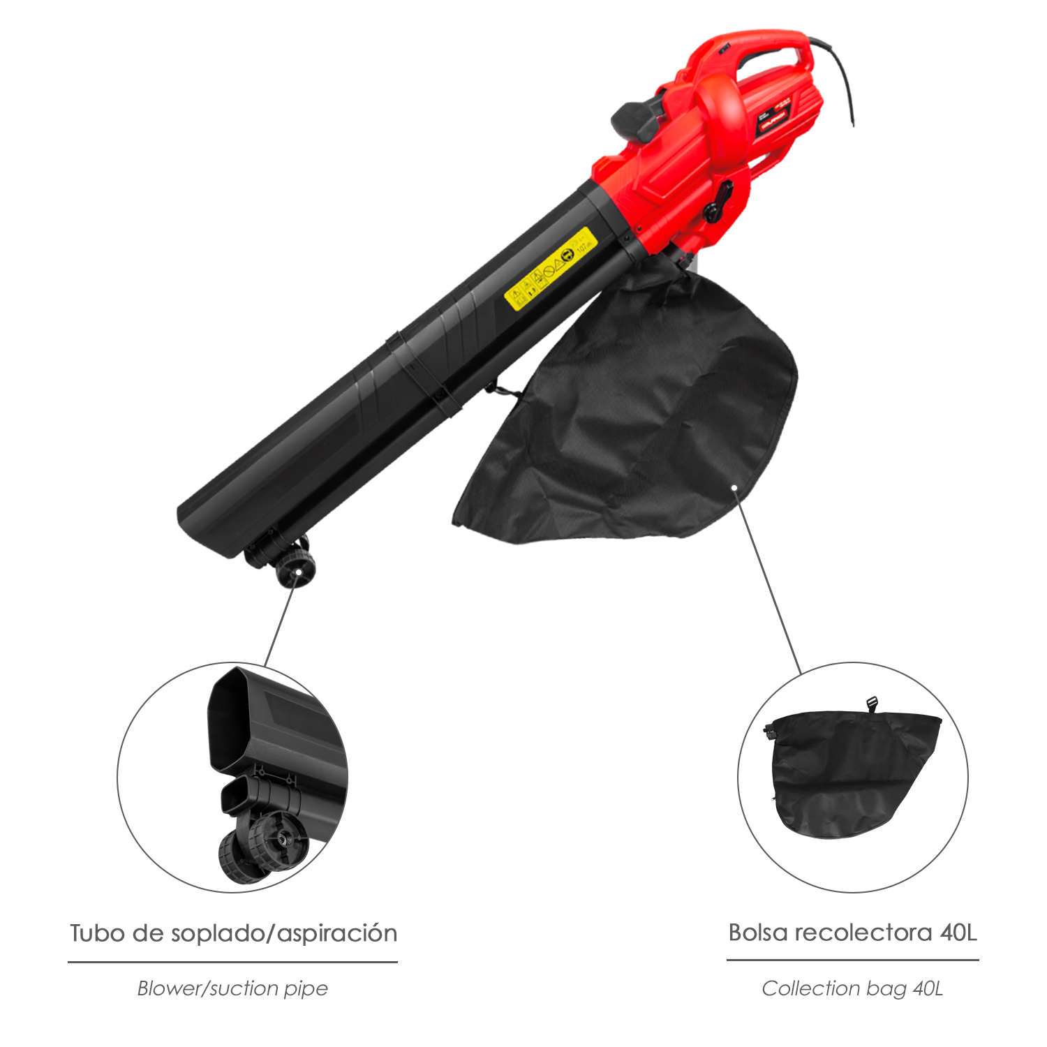 – Este versátil aspirador soplador cuenta con una bolsa recolectora de 40 litros de capacidad, la cual dispone de una práctica cremallera para facilitar su vaciado. Además, incorpora 2 ruedas guía que hacen más cómodo su desplazamiento durante la tarea de limpieza.